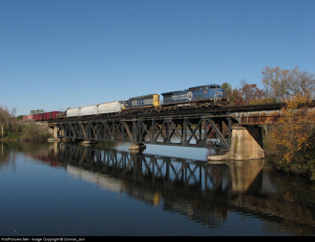 Former Conrail CSX 7333 leads an SD40-2 and 8 cars freight across the Thornapple River on Q326-28.
