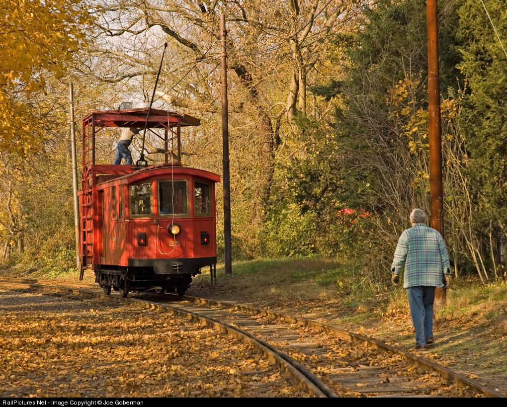 With the tourist season over for the Shore Line Trolley Museum, this line car is tightening the wires above the track. Originally from Ottawa, Canada, it has an insulated platform, allowing work on "live" wires.