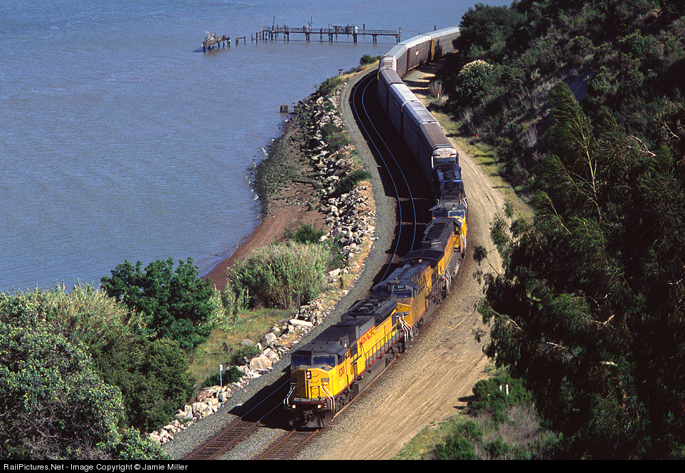 A westbound auto rack train begins it's trek along San Pablo Bay at the Bricyard, just west of Ozol Yard on the UP's Cal-P Line.