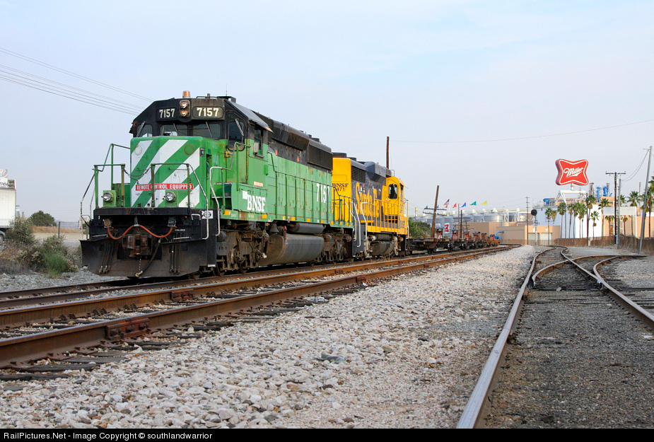 | BNSF 7157 and BNSF 2471 are the power on this baretable movement from San Bernardino to Irwindale located on the former ATSF Pasadena Sub. The Miller Brewery can be seen in the distance. |