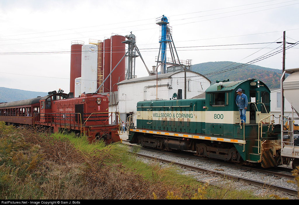 | Former Washington Terminal RS-1 #62 soldiers on hauling tourist on the former NYC line north of Wellsboro Jct., Pa. The northbound excursion train is seen meeting the Wellsboro & Corning freight at |