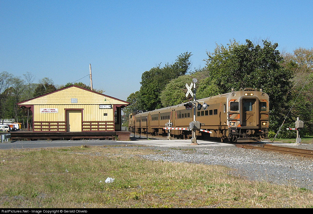 A filthy Comet IV Cab leads an Atlantic City bound train past the restored Pennsylvania Reading Seashore Lines Berlin station, built in 1867.