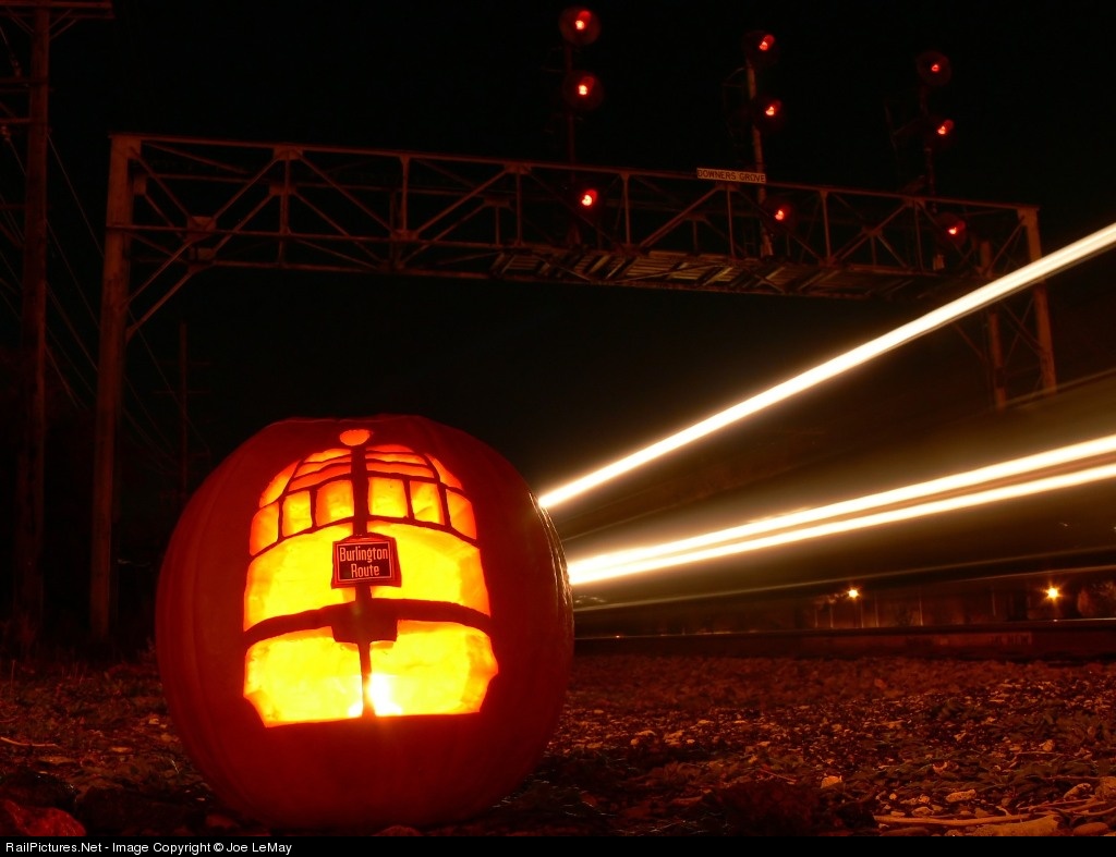 On May 26th, 1934, the Pioneer Zephyr made its record-breaking non-stop dawn-to-dusk run from Denver to Chicago, passing under this signal bridge. This night, an eastbound coal train led by a pair of SD70MACs does the same. Happy Halloween!