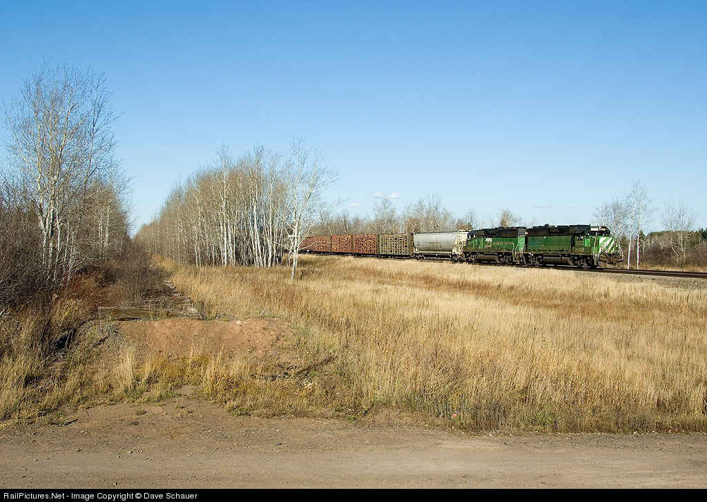 | A pair of Cascade Green 4-axle units lead a long Grand Rapids Local out of Superior and in the process parallel a long abandoned Soo Line grade, still with ties. |