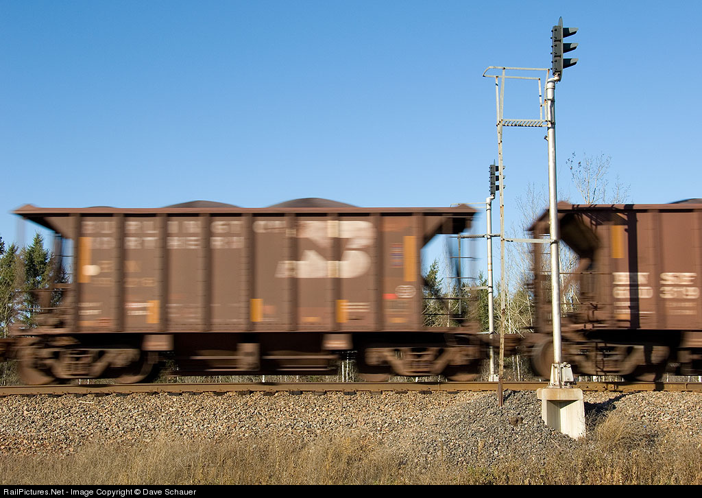 | The BN is starting to blur into the past, just like the logo on this 36-ft taconite car shown passing the signals at milepost 15.9 en route to Allouez (Superior). |