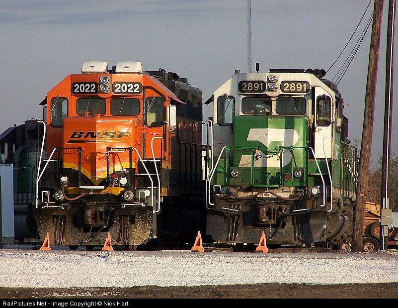 BN GP39M 2891 and BNSF new logoed GP38-2 2022 wait for assignments at Eola.