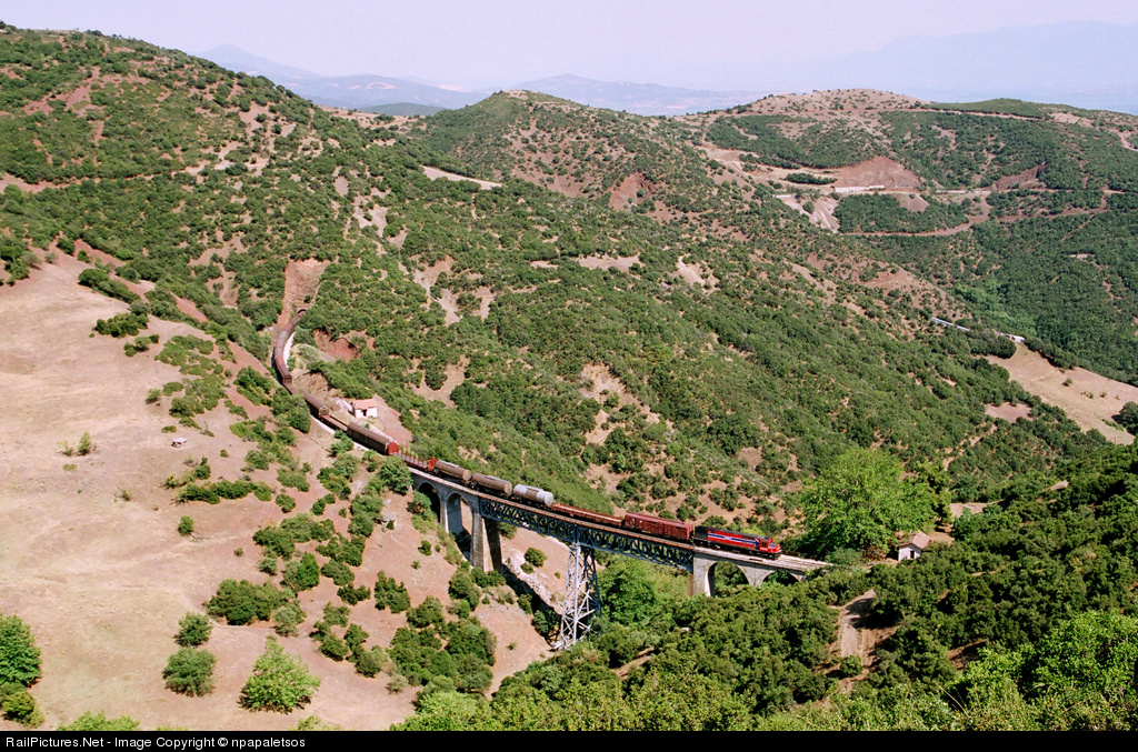 The direct freight train from Athens to the border station of Idomeni crosses one of the iron bridges of the Karia curve as it klimbes up on the mountain area of the main line