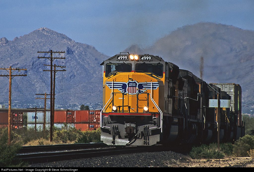 | UP 4999 East, a hot stack train from the West Coast, roars upgrade out of Tucson as it assaults the hill to Vail. |