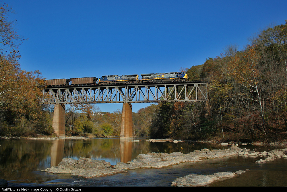 CSX 689 leads a long train of loaded CMIX coal hoppers over the Holston River.