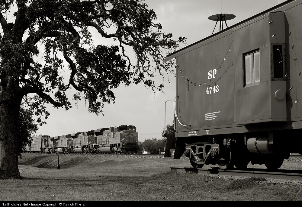 EB international containers heading toward Houston pass an old SP caboose in Flatonia, TX.