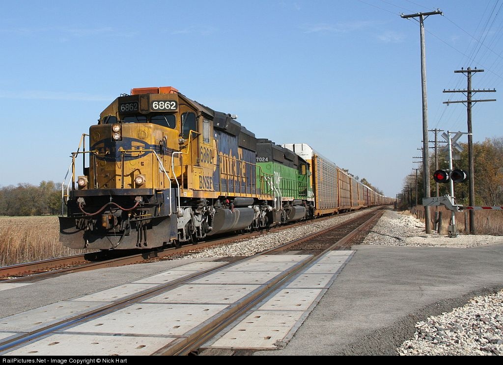 | BNSF 6862 and BNSF 7024 make their way west through Coal City with V MCIPHX (Vehicle train from McCook, IL to Phoenix, AZ). |