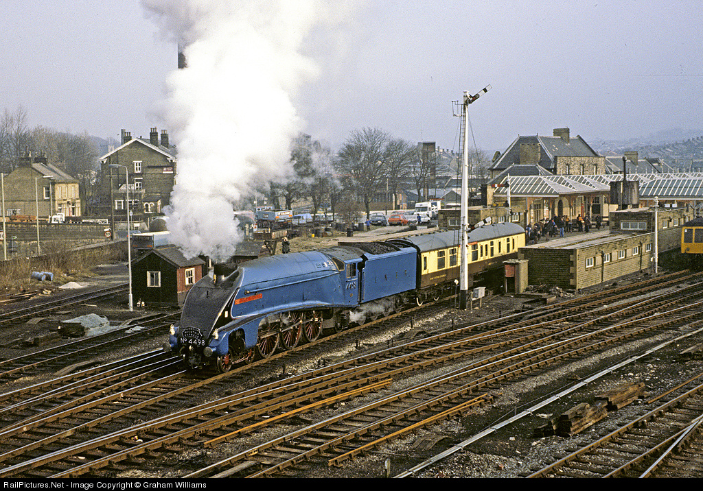 Way back in 1980, before this line was electrified, A4 Streamliner no. 4498 Sir Nigel Gresley moves away from the station at Skipton ready to move onto its carriages for a main line special to Carlisle.