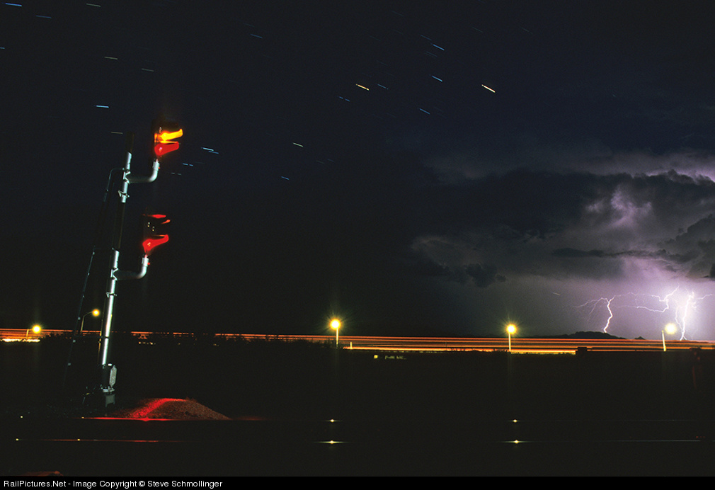 As the CTC signal at the beginning of double track displays a yellow aspect for an eastbound freight, a monsoon storm rages to the southwest.