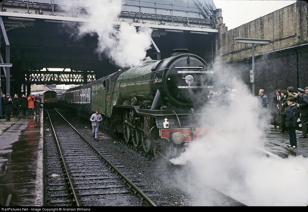 Way back in 1980, before this station was rebuilt and had all its character removed. 4472 Flying Scotsman attracts a lot of attention as it prepares to depart with a main line special to York on a really dull wet Winter's day.