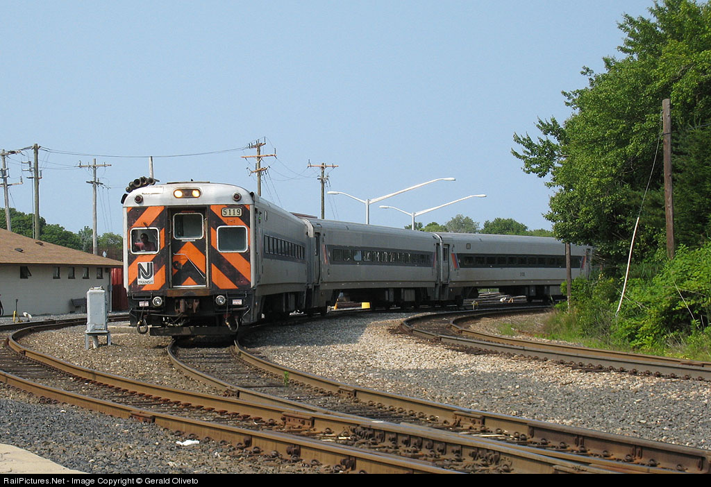 Former Erie Lackawanna Comet I Cab, painted with tiger stripes, leads a train around the curve at Bay Head Yard for a trip to Long Branch. The Comet I Cars are usually isolated to the Hoboken Division and rarely make appearances on the North Jersey Coast Line.