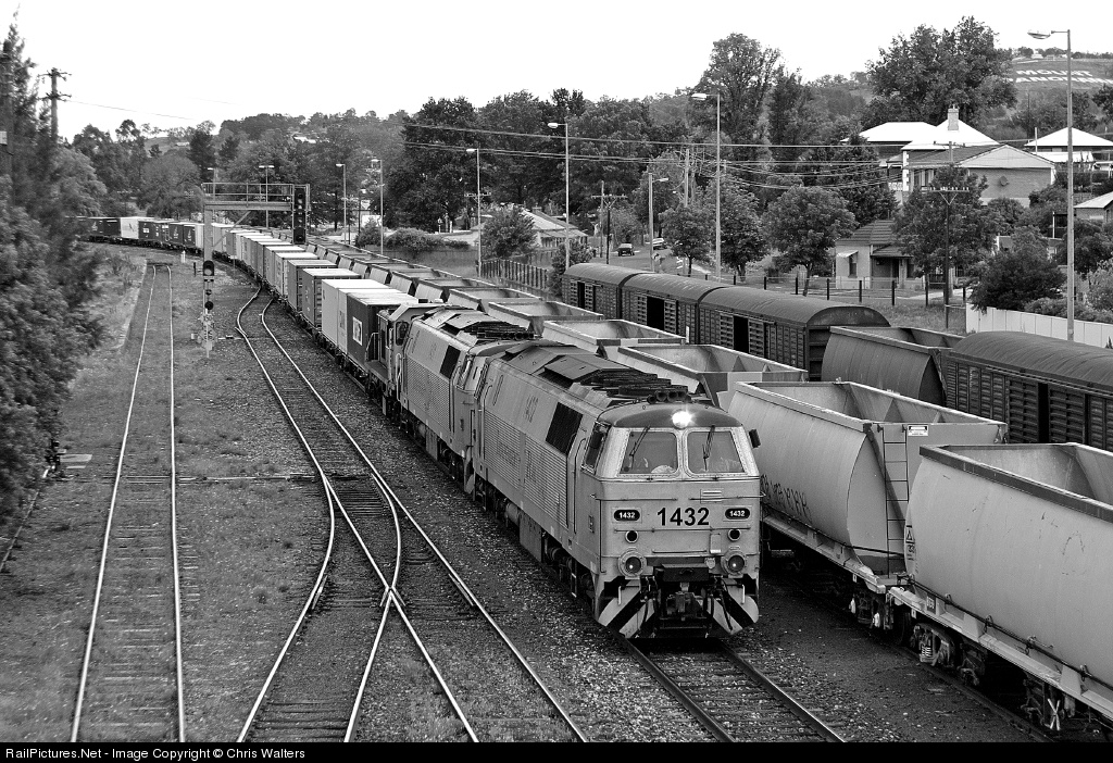 8162 freight from Blayney bound for Sydney, slows to a crawl through Bathurst Yard, behind former Danish DSB locomotives 1432 and 1431, leading Lachlan Valley Railway-owned 4703 (dead-attached).