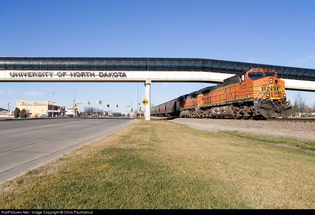 Fighting Sioux! (<-I guess I'll have to remove that in 3 years when UND loses their mascot, but until then...). A southbound unit grain train rolls under the University of North Dakota's Hamster Tube on a warm (60F) and pleasant afternoon. Learn more at Grand Forks Railfanning.