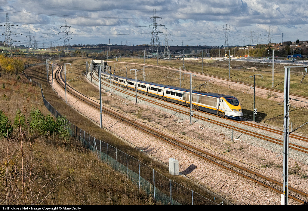 | The first Eurostar to run from St. Pancras to Paris (11:01 ex St.P.), the VIP special running through Southfleet Junction formed of units 3001 and 3002, 3002 leading. The now redundant lines to the link to Fawkham Junction and Waterloo fan out either side of the 'main line' to St. Pancras. Note EXIF clock 1 hour wrong time of shot is 11:15hrs.
