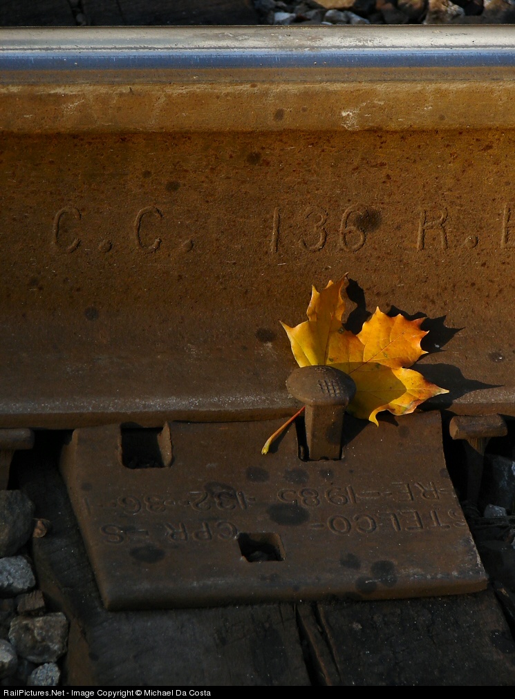 | A lone maple leaf hangs onto the spike on this cold windy autumn day, as the days grow shorter the challenges of winter railroading lay straight ahead, not only for me as a railway employee but for other railroaders and MoW guys alike. |