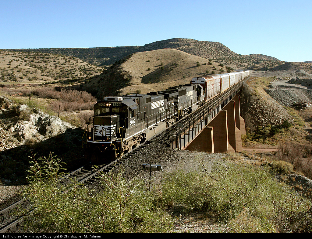 | BNSF McCook, IL to Phoenix, AZ vehicle train V-MCIPHX8-20A emerges from Abo Canyon behind NS 8869 and NS 6610. Just across the bridge lies the only scars to date from the on-hold BNSF double track project through the canyon. Only one hill has been removed. To view this album, visit http://www.rrpicturearchives.net/archiveThumbs.aspx?id=26590 |