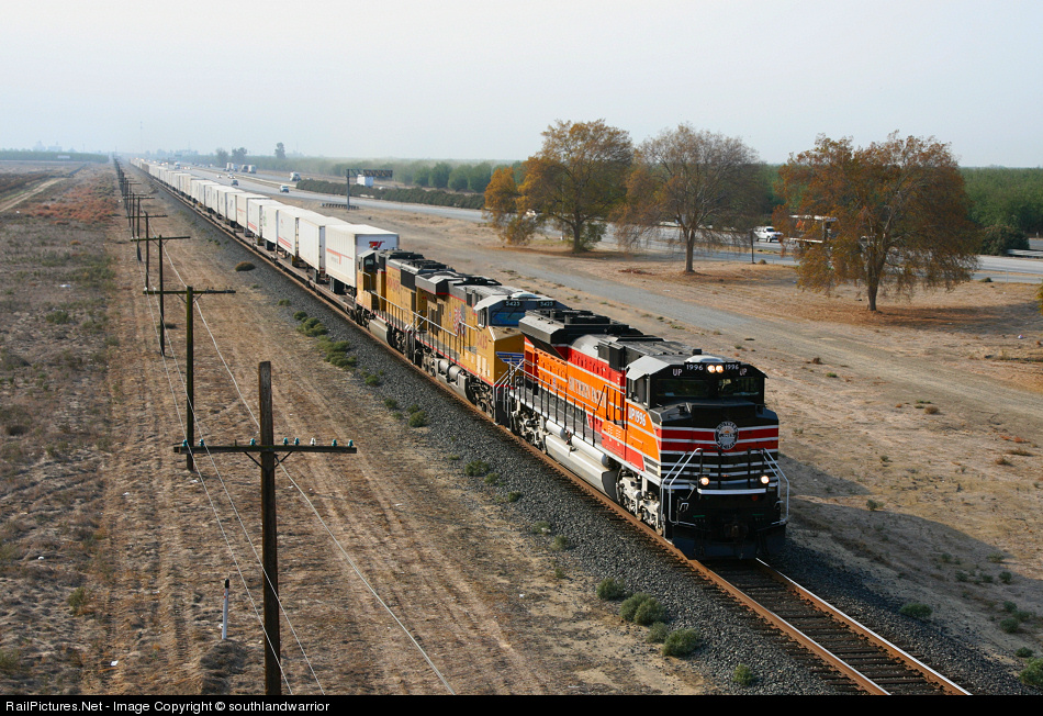 | Approaching the siding at Delfar on the UP's Fresno Sub is the Southern Pacific heritage engine on the point of the northbound ZLCBR trailer train bound for Portland, Oregon. |