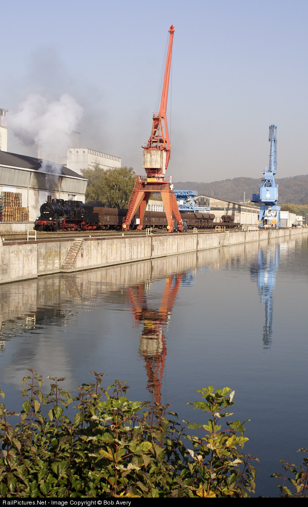 | A Romanian built 0-10-0 in the care of OGEG (Austrian preservation group) works a chartered freight consist on the harbour lines in Linz. The docks serve barge traffic on the River Danube, but sadly seem largely devoid of commercial river traffic. |