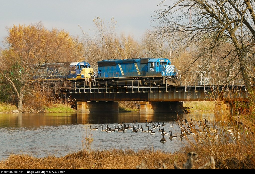 Leased power is on point of this southbound CSXT merchandise train, crossing the Kankakee River at Momence, about an hour out of Chicago. The double-track UP Villa Grove Sub is a joint UP-CSXT line down to Woodland Junction, where the lines split, one CSX line heading for Danville, one UP line heading for St Louis.