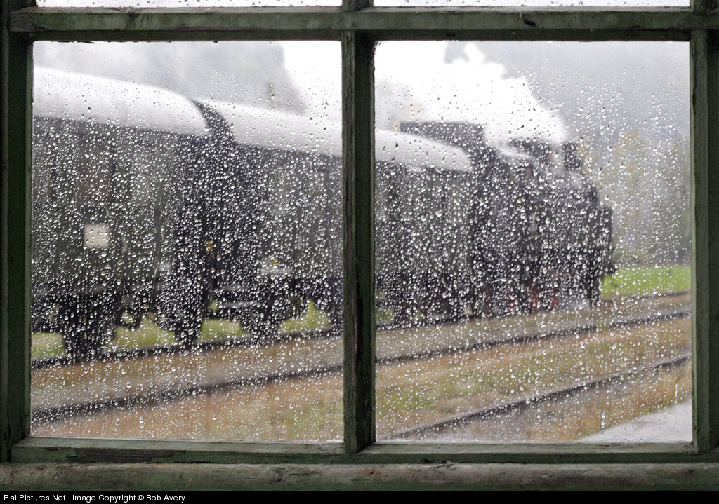 Pacific Tank - an uncommon wheel arrangement - 77 28 is seen through a station window on a particularly wet morning.