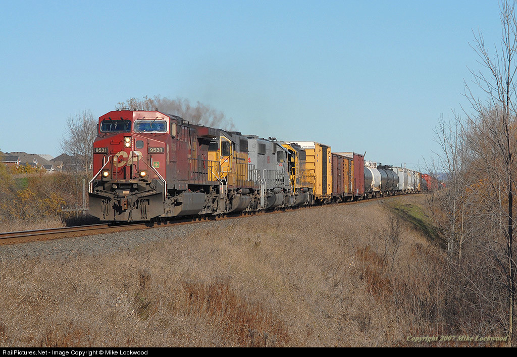 In a throwback to Canadian Pacific's mid 1990's penchant for leased power, CP 9531 leads rent-a-wrecks NREX 9903, NREX 4294, and NREX 6503 on train 235 at Bowmanville, Ontario. I can take or leave the SD40-2's, but that former Santa Fe SD45-2 is nice sight on the Belleville Sub. 1248hrs.