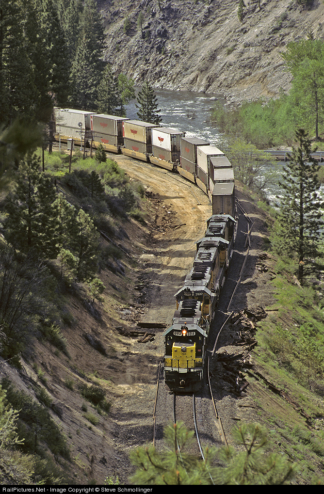 A westbound stack train follows the course of the river to traverse the Sierra Nevada Mountains.