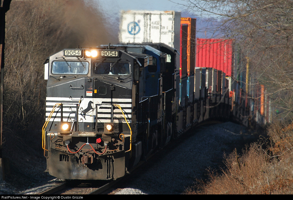 NS 9054 decends a grade with loaded double stacks bound for Norfolk still pulling the grade behind.