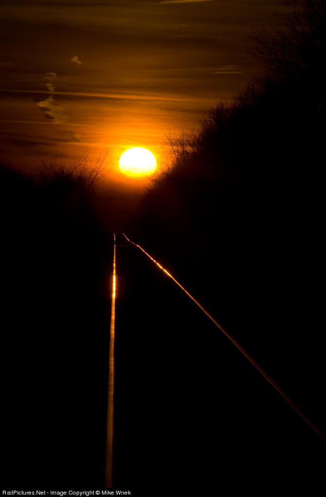 The sun, filtered through a thin band of cirrus clouds, is about to set almost directly down the Illinois Railway's Ottawa line, just after its last train of the day has headed down it.
