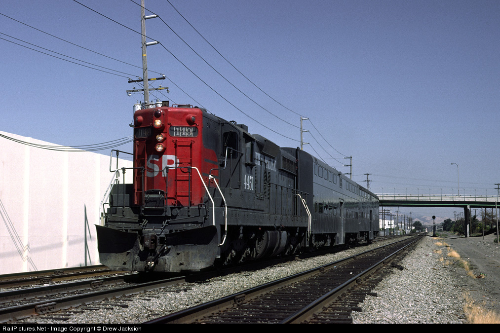 | On its way to San Francisco with commute train #149, SP 4451 has just passed under Scott Blvd. #4451 and stablemate 4450 were know as "Huff and Puff". The locomotive survives, but is rusting away in Schelleville, CA awaiting the reopening of the NWP which may never come. |