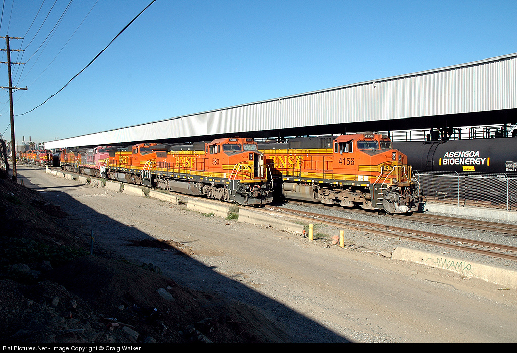 | BNSF Dash 9-44CW 4156 pulls train M-WATBAR1-24A out of Watson Yard in Wilmington, California, and past two four-unit sets of Dash 8-40BW diesels. In the background is the ethanol unloading facility. |