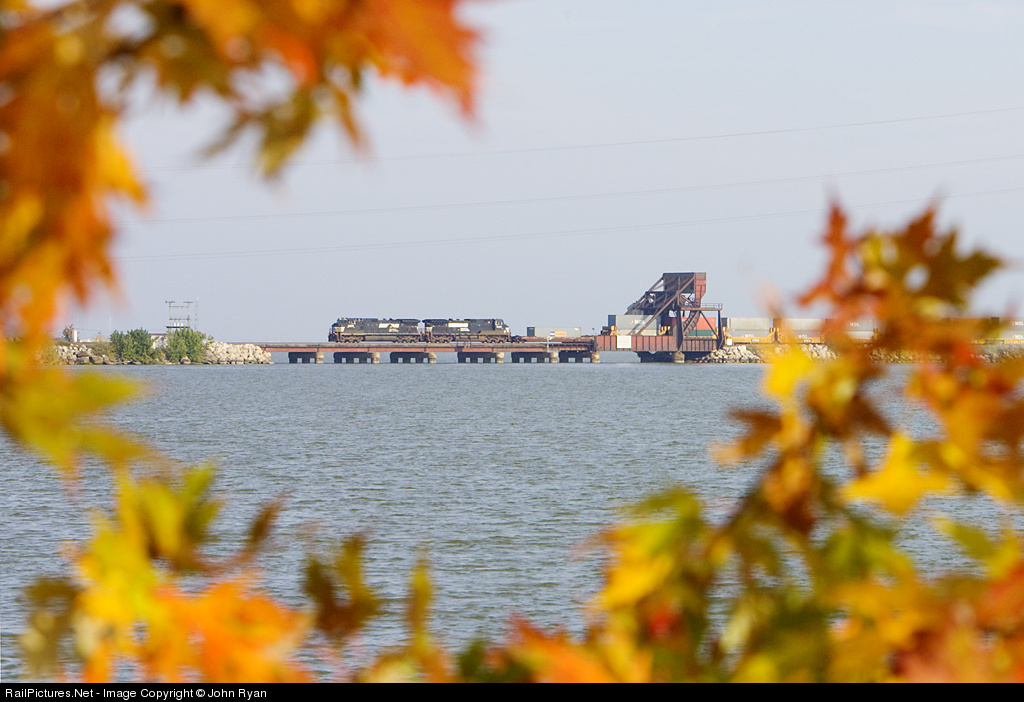 A westbound NS stack train pounds across the Sandusky Bay drawbridge on a glorious fall afternoon.