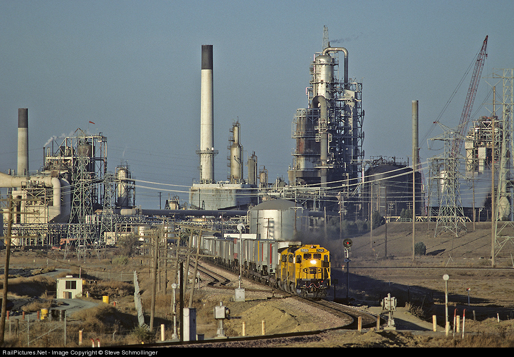 A hot 199 train out of Chicago roars through the Tosco Oil Refinery at Maltby as it approaches the beginning of the 1.0 percent climb into Franklin Canyon.