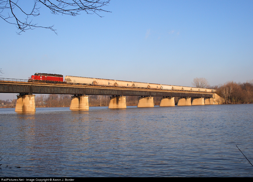 A single SD40-2 leads a southbound grain train across the Maumee River south of Liberty Center on the former DT&I.