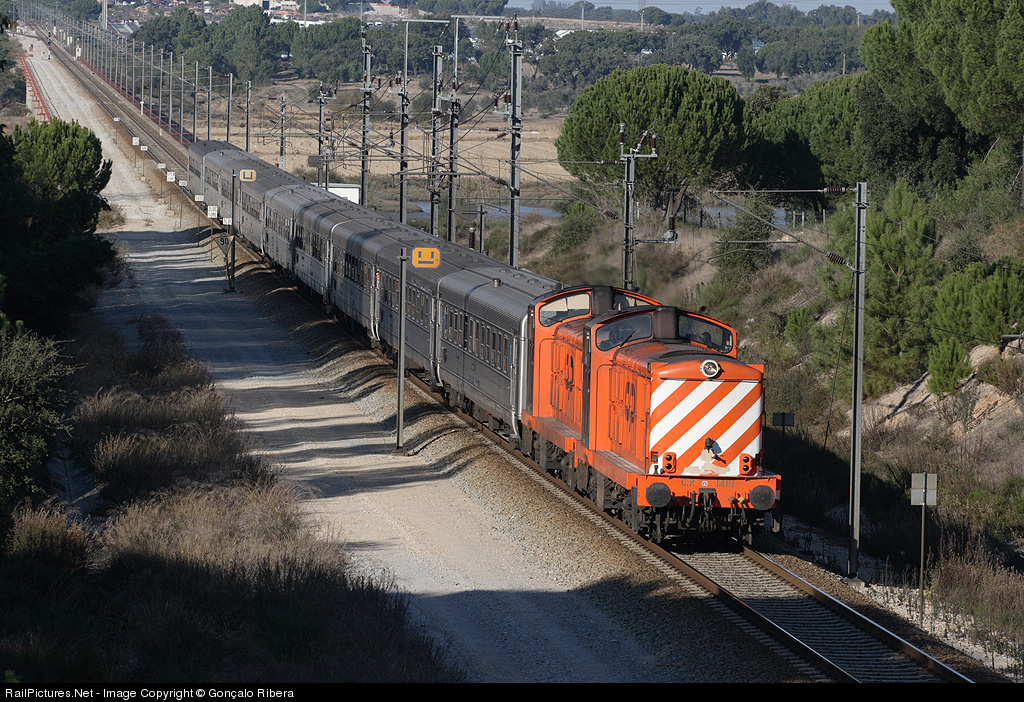 | Just passed a neutral zone, this double traction of 1400s went to Portimão. This was a special train, rented by students of the Medicine University of Porto to pass the weekend at Algarve. |