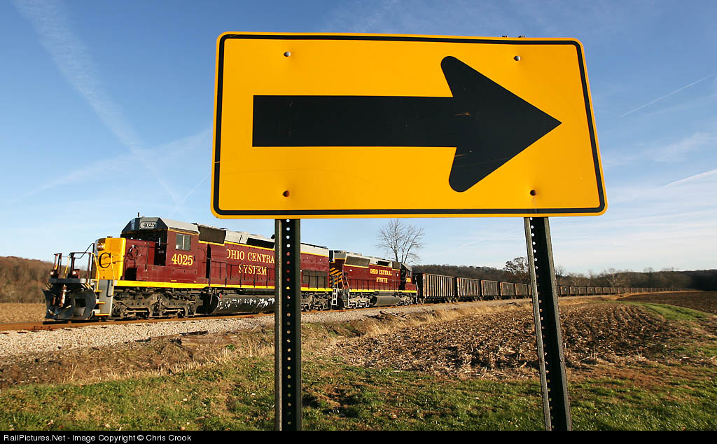| A sign warns of a sharp turn for southbound traffic on North River Road West, but the Cleveland, Canton & Southern Railroad chose a more gentle turn when it wound it's tracks along the Muskingum River to Zanesville in the 1880s. Ohio Central's 4025 swings to the north as it leads a coal train out of town on tracks later owned by the W&LE, NKP and N&W. |