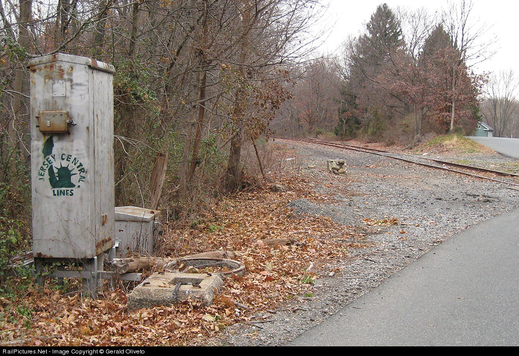 These now out of service tracks once carried the Jersey Central Railroad's Main Line through the township of Glen Gardner in Hunterdon County. Looking west from Bell Avenue, the only road with a grade crossing in town, one can see the abandoned remains of crossing signal equipment. Crudely painted on the control box is a Jersey Central logo that preserves the history of the "Big Little Railroad." Not a bad looking logo by whoever painted it! For photos of the abandoned ROW farther west, view photo 217206 and photo 218135.