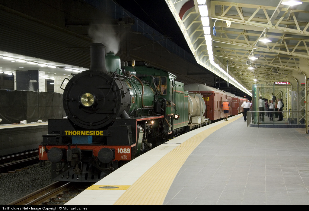 | Passengers begin to alight from the ARHS Iron Road Restaurant, led by BB18ΒΌ 1089, at Roma Street after travelling to Bethania and Thorneside. |