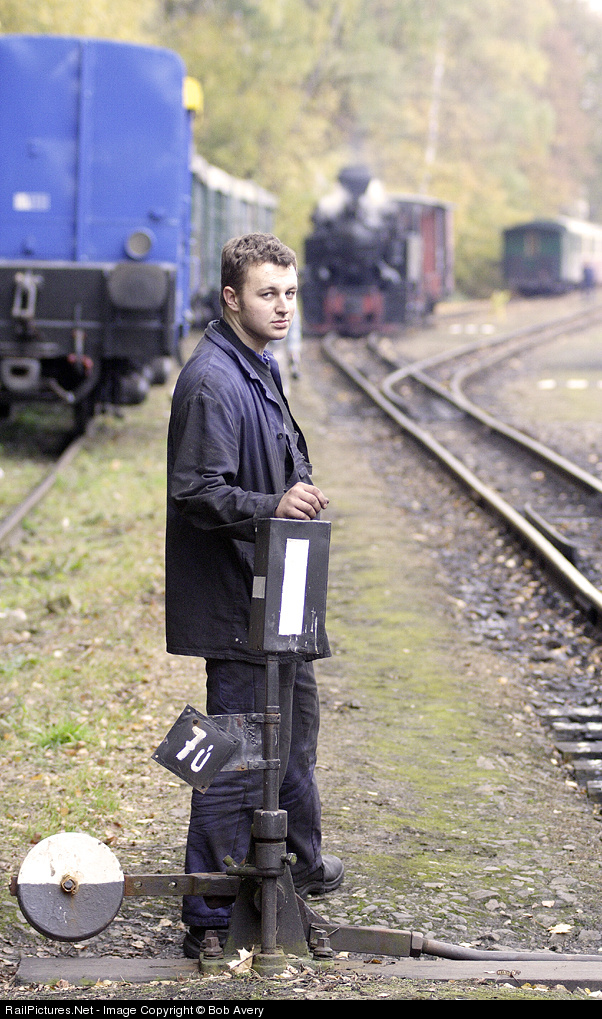 | The big 1958 built Resita 0-8-0T puts together its train for the afternoon run to Strizovice, as the brakeman tends the switchstand. |