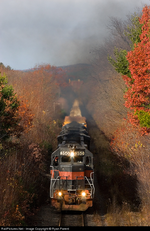 | Guilford's vintage power smokes it up pulling the slurry train upgrade out of Orange. The train is enroute from Bellows Falls, VT to Portland, ME. |