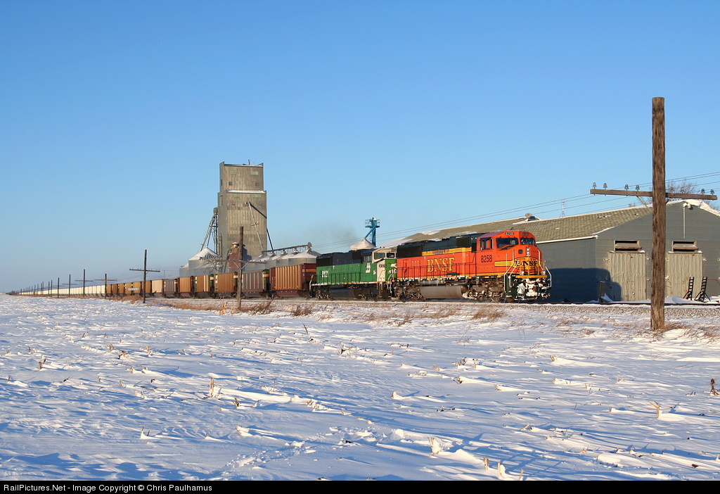 Ah, yes, North Dakota in December...snowy white, bitter cold, and when the sun does come out, crystal blue skies. You could also say barren, featureless, and boring, but that's why it's nice to have colorful locomotives like these to spice up the scene! Coal empties southbound through Merrifield.