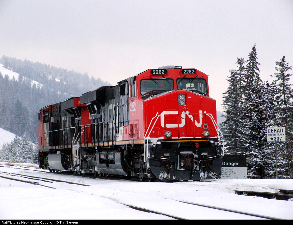 CN 2247 and 2262 reverse back into Jasper's Yard to tie back onto their train, after doubling over from track five to nine. U762 consisted of 14 grain empties for Edmonton, and 104 coal empties, most of which are bound for Progress Rail's Car Service in Corbin, KY.