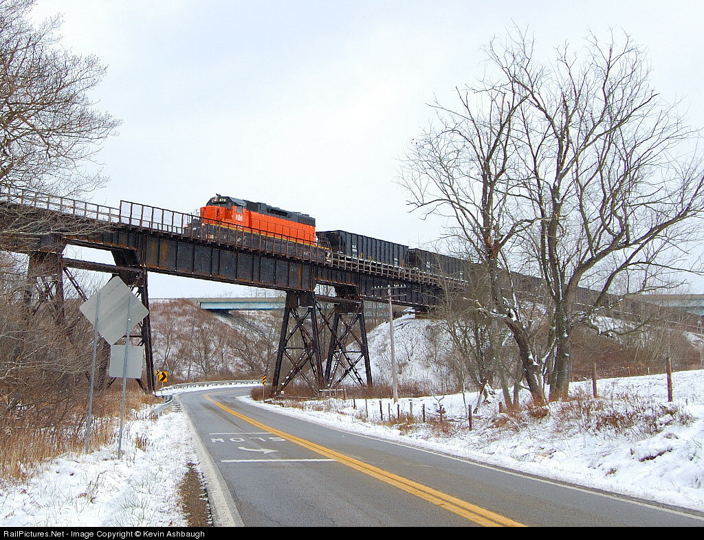 | 878 North crosses Kimbles Viaduct with 18 empty hoppers in tow after he gets the clear signal at Filer North for being held up for M&W to get out of his way. The SB I-79 bridge can be seen in the background over the original BLE ROW running to the photo's left, parallel to Scrubgrass Rd. rounding the curve. |