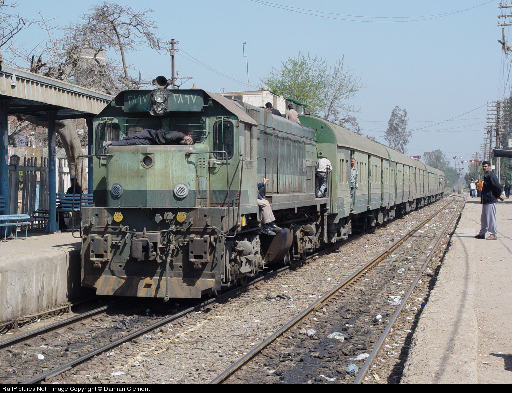 | 3897 pauses at Tahanub with the 1000 from Cairo Limun to el-Marg, complete with man sleeping on the top of the short hood. |