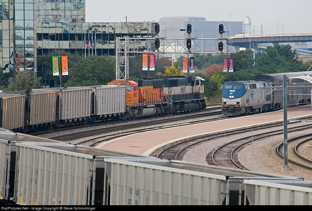 | A westbound BNSF coal empty meets Amtrak train No. 22 at Dallas Union Passenger Terminal. The BNSF train will cross over to the TRE line beyond the station for the run to Ft. Worth, as indicated by the yellow aspect in the lower signal. |