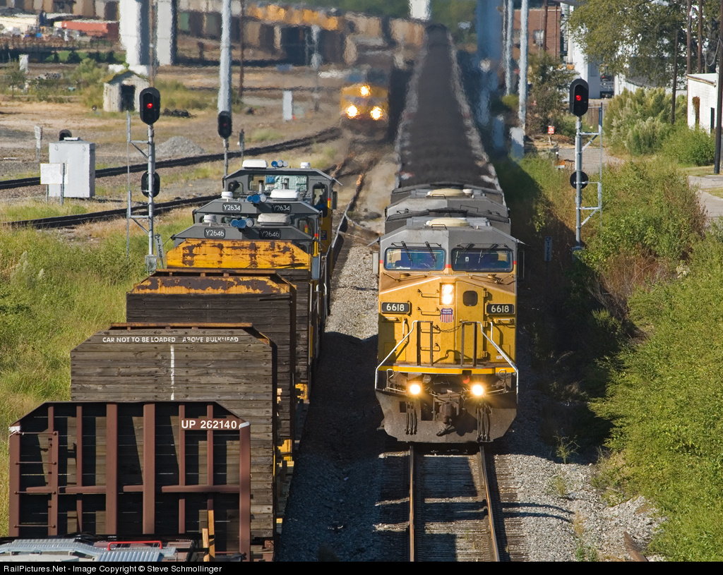 UP 6618 South, a coal load out of the PRB, bears down on a local coming north from Ney Yard as a coal empty makes its way onto the Choctaw Sub in the distance.