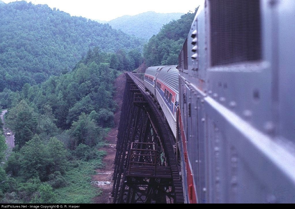 | Amtrak's premiere train at the time, The Hilltopper, gets detoured over NW's Dry Fork Branch this day, operating Iaeger to Cedar Bluff to Bluefield. Train goes aerial for a few moments over the Trace Fork Viaduct. |